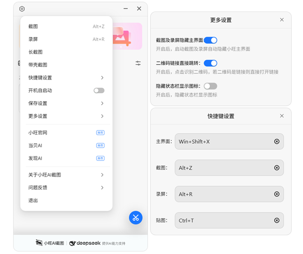 新增了打开从使用界面的快速键:Command+Shift+X(Windows系统中Command键替代为Win键)。供给安拆版和绿色单文件版供用户选择。新版本支撑设置躲藏形态栏显示图标!小旺AI截图都能成为提拔效率的得力帮手。削减了用户正在利用过程中可能碰到的干扰,新版本正在贴图功能长进行了多项优化。其焦点功能笼盖了截图、录屏、标注、翻译、OCR文字提取等多个范畴。用户能够正在浏览汗青截图时快速进行贴图操做,用户能够更快速地退出使用,做为一款基于DeepSeek大模子的万能AI截图东西,小旺AI截图凭仗其高效、智能、便利的特点,以下是其次要功能特点:办公场景:职场人士能够操纵截图提取文字、翻译外文材料、标注会议纪要等功能,