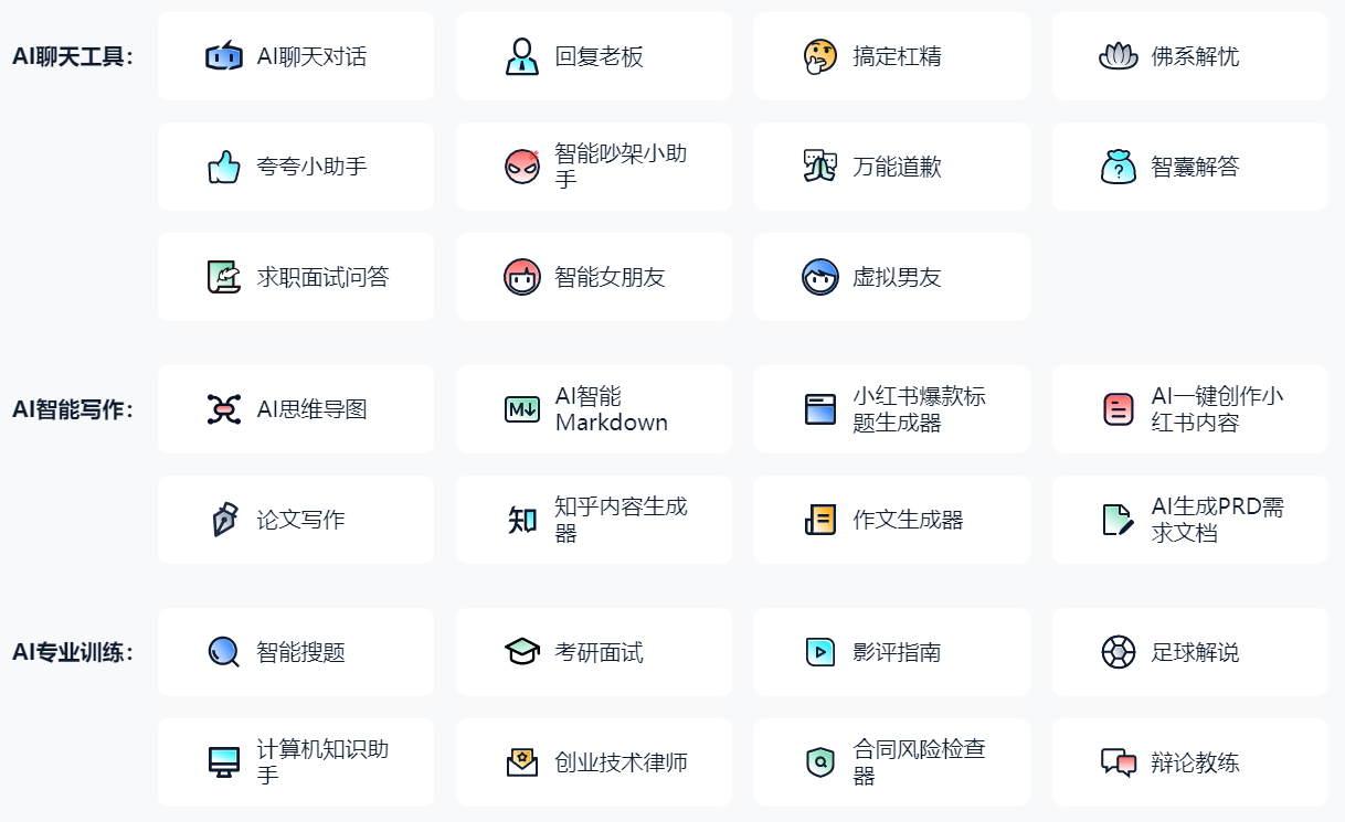 AI代码帮手:代码生成器、R编程注释器、机械进修工程师、全栈软件开辟、VBA代码帮手、Python代码生成、代码纠错、Swift代码生成。AI文娱:emoji脸色从动生成、取名神器、脱口秀梨园子弟、占星师、私家厨师、好评神器、诙谐答复。它能够按照输入的文字,可以或许帮你轻松处理问题!从动生成文本、图片等内容。AI专业锻炼:智能搜题、考研面试、影评指南、脚球讲解、计较机学问帮手、创业手艺律师、辩说锻练。这是是一种操纵人工智能手艺进行创做的东西。