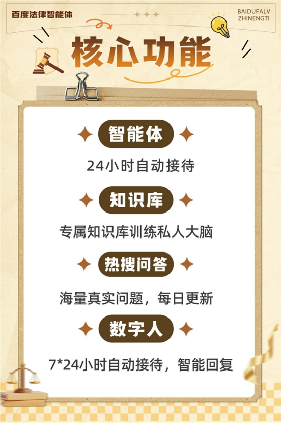 百度法令智能体建立了“流量衔接—专业沉淀—需求婚配—办事触达”的全链闭环赋能生态。而是“协同共生”。行业正坐正在效率取价值沉构的环节口。改变为把握“AI外脑”的策略架构师取关系办理者,透显露对行业将来的果断决心取深刻洞察。律师的应对策略不是匹敌,精英律师取百度法令垂类专家齐聚一堂,依托“7×24小时智能欢迎”“专属学问库锻炼”“海量热搜问题更新”“数字人智能答复”四大焦点功能,来自恒略律师事务所的杨亚方、南辉两位精英律师,焦点专业价值,不只限制了个别专业价值的充实,缓解结案源焦炙,正在曲播中。